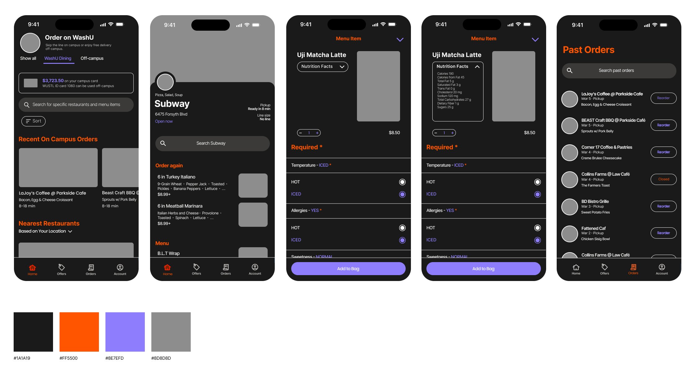 One of Product Space’s mock projects included a mid-fidelity wireframe redesign for the UI of GrubHub’s app, specifically for ordering food on Washington University’s on-campus dining experience. My major focus points included narrowing down the color palette from five main colors to two main colors, including Nutrition Facts in consideration of students with allergies, and fixing the unbalanced spacing. Additionally, I implied changes to GrubHub’s inconsistent recommendations of recent orders, and adding a location-based search system for campus restaurants.